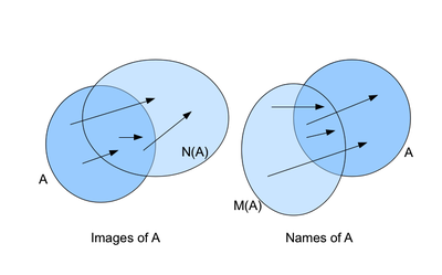 Figure A. Set A and its images M and names N. For an arbitrary set A there is no restriction on how it might overlap with its images and names. The arrows show examples of elements realizing the signification and the N and M set mappings. If set A is unconscious then N(A) would be completely contained in A. If A is imagined then M(A) would be completely enclosed in A.