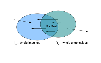 Figure B. Υ0 and Ι0 intersecting into R. The arrows again indicate possible significations. Note how they observe the restrictions imposed by the definitions of these sets: no arrow points into the unconscious from its outside, no arrow points out of the imagined outside of it.