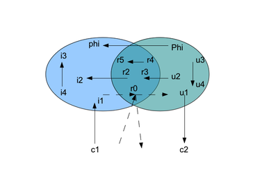 Figure C produces a number of examples of signifiers/signifieds residing in various regions of Ω identified by the configuration of the whole Unconscious Υ0 and whole Imagined Ι0 and being in signification relation Σ. u3 → u4 are elements in the Unconscious. Similarly, i4 → i3 are in the Imagined. c1 points into the Imagined i2 from the Conscious space, whereas u1 in the Unconscious has a Conscious image in c2. This is all quite well expected.